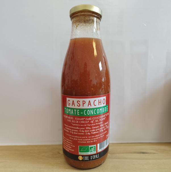 -) Ingrédients: tomate*(54%), concombre*(27%), eau, jus de citron*, ail*, sel, poivre*