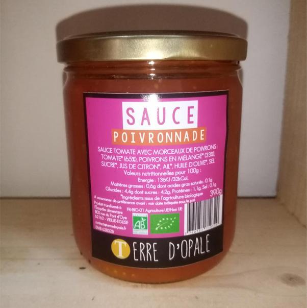 Ingrédients : Sauce tomate avec morceaux de poivrons ; tomate* (65%), poivrons en mélange* (33%), sucre*, jus de citron*, ail*, huile d'olive*, sel.