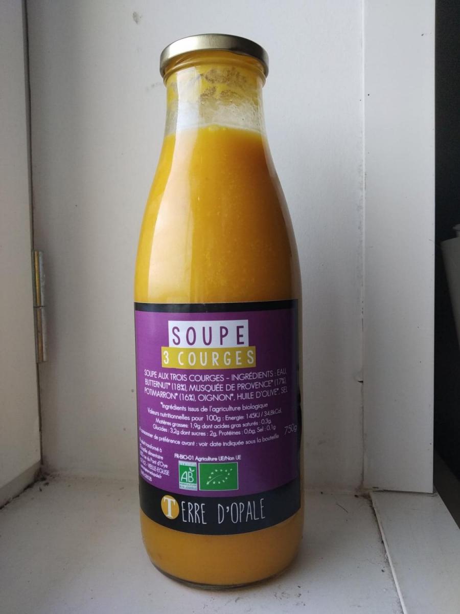 Ingrédients : Eau, Butternut* (18%), Musquée de provence* (17%), Potimarron*(16%), Oignon*, Huile d'olive*, Sel